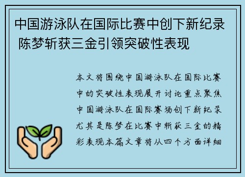 本文将围绕中国游泳队在国际比赛中的突破性表现展开讨论,重点聚焦中国游泳队在国际赛场创下新纪录,尤其是陈梦在比赛中斩获三金的精彩表现。本篇文章将从四个方面详细阐述这一突破:一是中国游泳队在国际比赛中创下...
